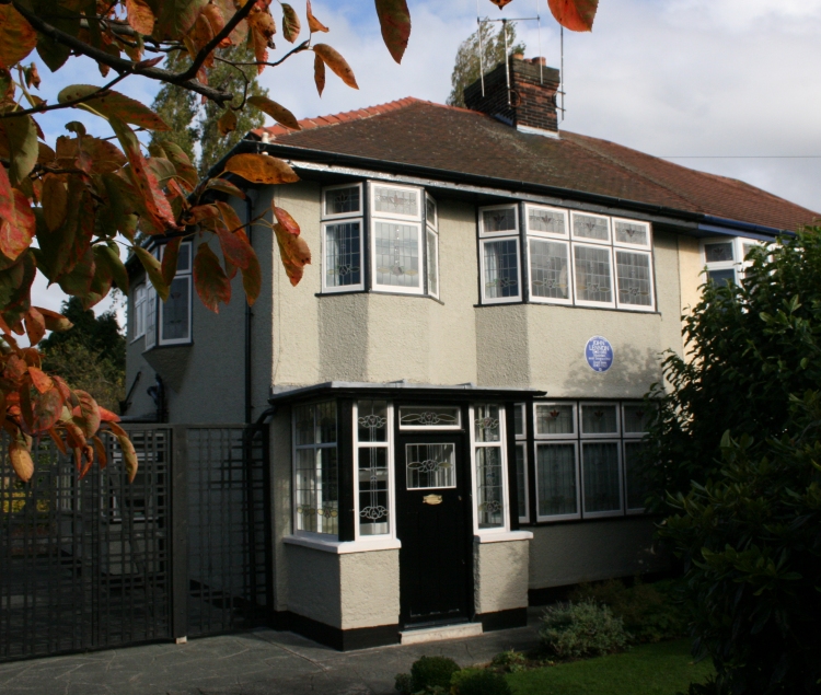 | Als de bus de hoek om gaat, rijden we op Menlove Avenue en een paar honderd meter verder staan we even stil voor nummer 251, het huis "Mendips" waar John Lennon van 1945 tot 1963 bij zijn tante Mimi heeft gewoond. Het huis is in 2002 aangekocht door Yoko Ono en vervolgens geschonken aan The National Trust, die het geheel in de originele stijl van eind jaren vijftig heeft teruggebracht. | ![]() | |